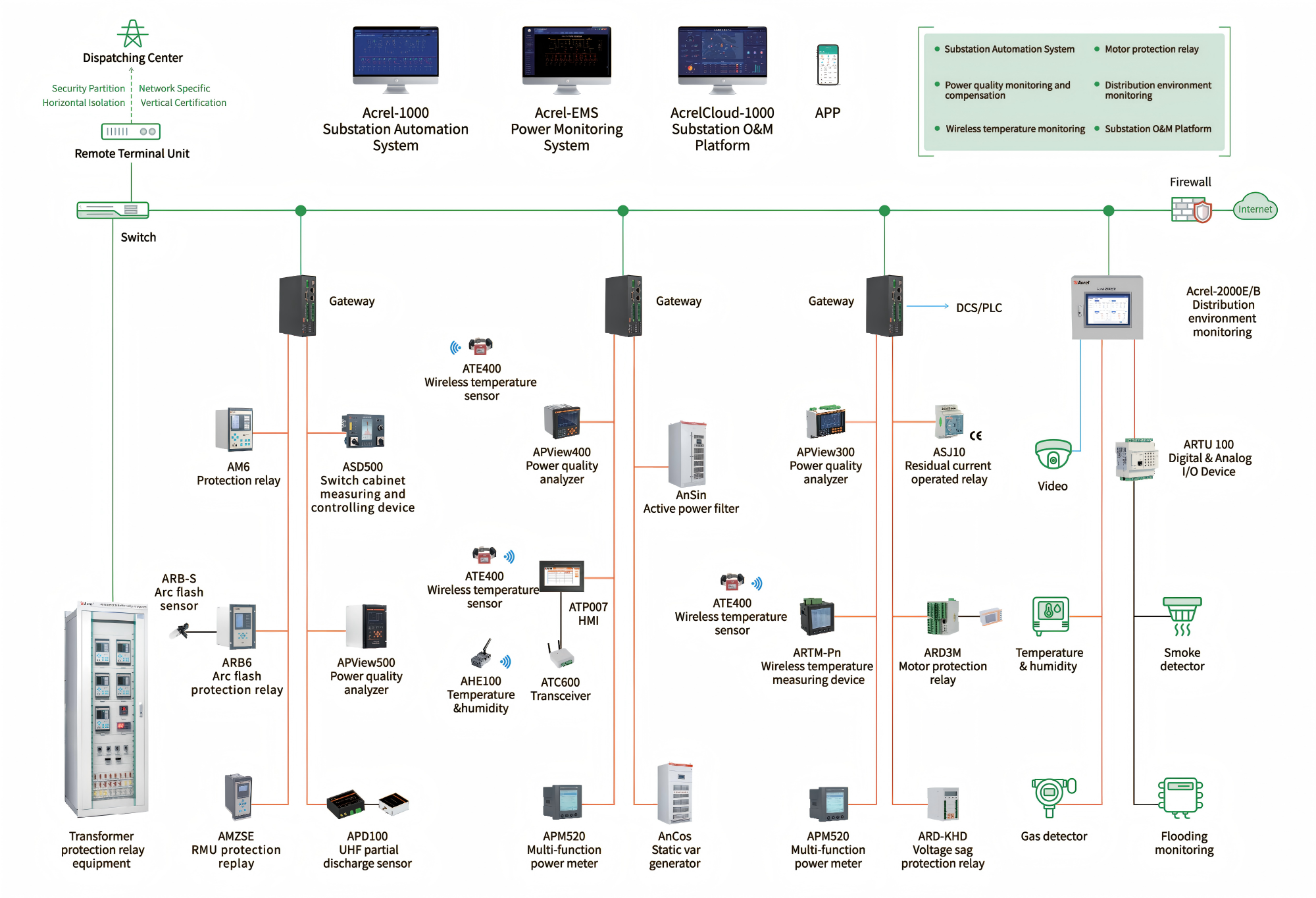 Az Acrel Substation & Distribution Room Solution átfogó, kiberbiztonságos digitális infrastruktúrát biztosít az energiaellátó rendszerek számára. A megoldás védelmi reléket, energiaminőség-elemzőket és ívvillanásvédelmi reléket tartalmaz a kritikus tápellátási berendezések védelmére. A vezeték nélküli gyűjtősín hőmérséklet-érzékelők és a részleges kisülési termékek lehetővé teszik a kapcsolóberendezések állapotának folyamatos nyomon követését.