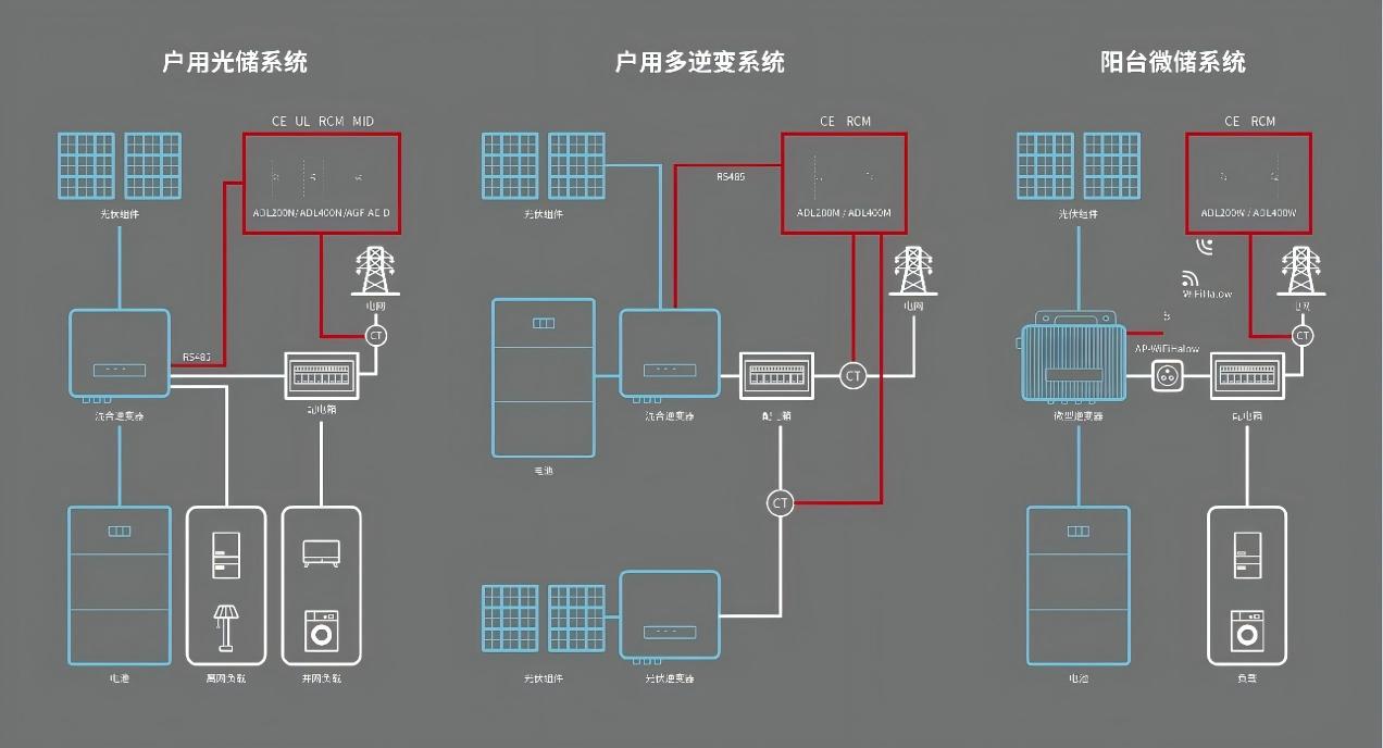 Több inverteres háztartási rendszer: Az alap PV/tároló rendszer alatt egy további PV/tároló rendszert utólag szerelnek fel, hogy több inverteres konfigurációt hozzanak létre. Az ADL-mérők kölcsönhatásba lépnek a fő hibrid inverterrel, figyelve az eredeti PV-generációt és a hálózati csatlakozási pont áramát, hogy elérjék a visszaáramlás-ellenőrző funkciót.