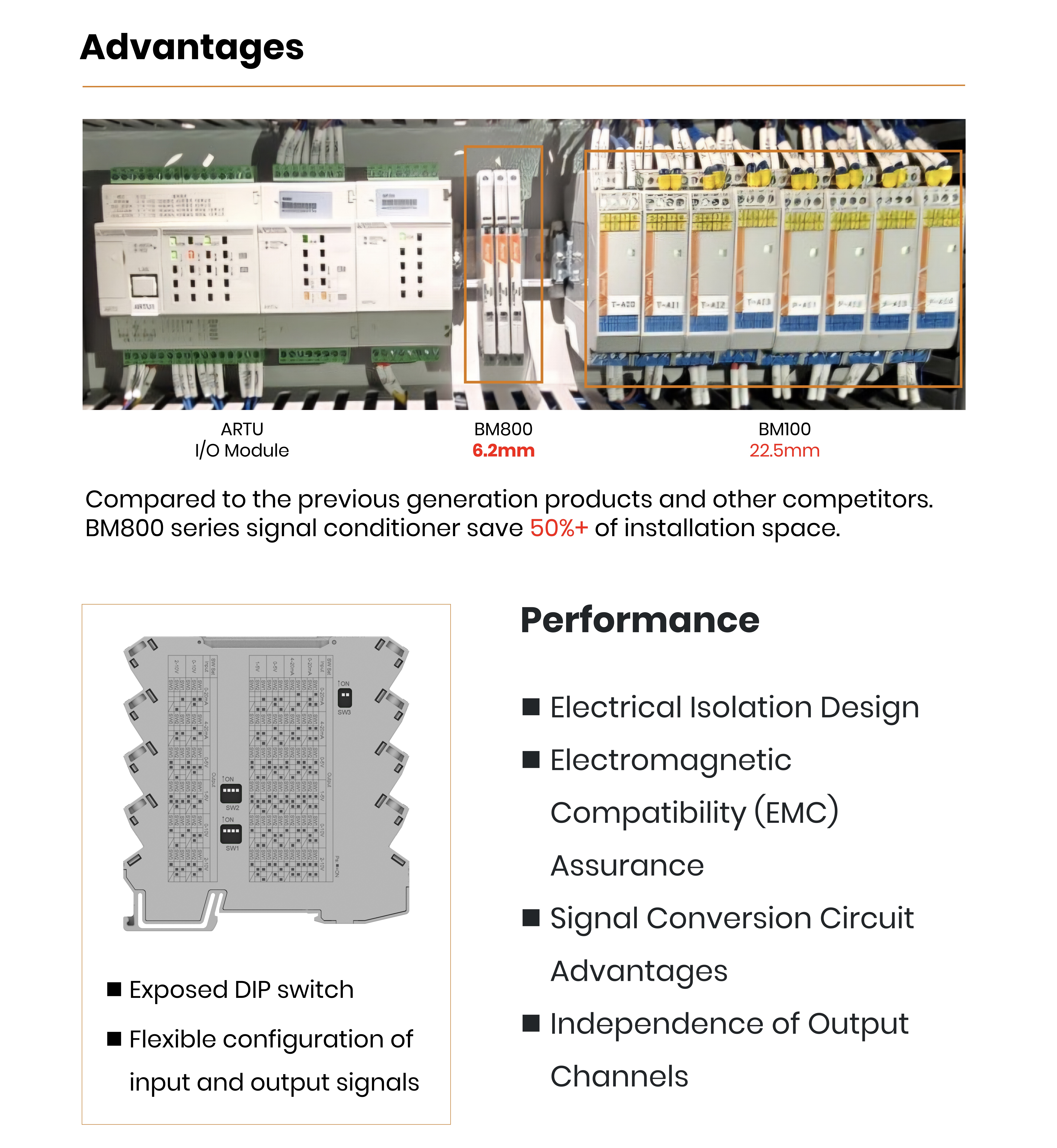 A BM800 sorozatú jelkondicionáló, más néven jelleválasztók, jelátalakítók és jelátalakítók, egy fejlett ipari jelkondicionáló eszköz, szupervékony, 6,2 mm-es kialakítással, amely a telepítési hely több mint 50%-át takarítja meg. 0,1%-os pontossággal, elektromágneses kompatibilitási biztosítékkal és olyan funkciókkal büszkélkedhet, mint az elektromos leválasztás, a jelátalakító áramkör előnyei és a független kimeneti csatornák. A rugalmas bemeneti és kimeneti jelkonfiguráció érdekében kialakított DIP-kapcsolóval különféle jeleket tud feldolgozni, például 0/4-20mA, 0/1-5V stb. Kiváló teljesítményt nyújt a hőmérséklet-eltolódás, a válaszidő és a szigetelési erősség terén is.
